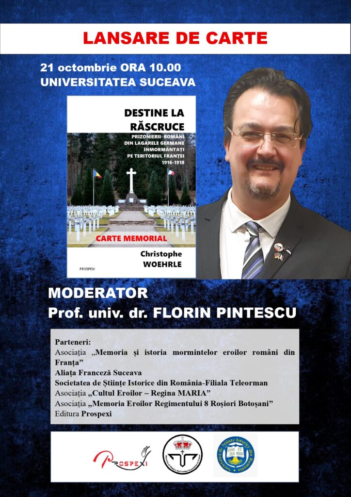 Suceava, 21 octombrie 2025 – Facultatea de Istorie, Geografie și Științe Sociale (FIGSS) din cadrul Universității „Ștefan cel Mare” Suceava a găzduit astăzi lansarea volumului „Destine la Răscruce. Prizonierii români din lagărele germane înmormântați pe teritoriul Franței 1916–1918”, semnat de istoricul francez Christophe Woehrle, originar din Alsacia.